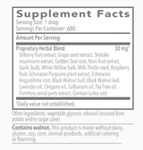 Bilberry fruit extract, Grape seed extract, Shiitake mushroom extract, Golden Seal root, Noni fruit extract, Garlic bulb, White Willow bark, Milk Thistle seed, Raspberry fruit, Echinacea Purpurea plant extract, Echinacea Angustifolia root, Black Walnut hull, Black Walnut leaf, Lavender oil, Oregano oil, Galbanum oil, Tea Tree oil, Fumitory aerial parts extract, Gentian Lutea root