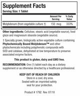 Mo-Zyme Forte supplies a supplemental source of molybdenum (Mo), as a whole food, phytochemically bound vegetable culture form. Mo is an essential trace element, and plays an important role in human life as a co-factor for several enzymes, such as sulfite oxidase, which converts sulfite to sulfate.* Each tablet of Mo-Zyme™ supplies 150 mcg of molybdenum.